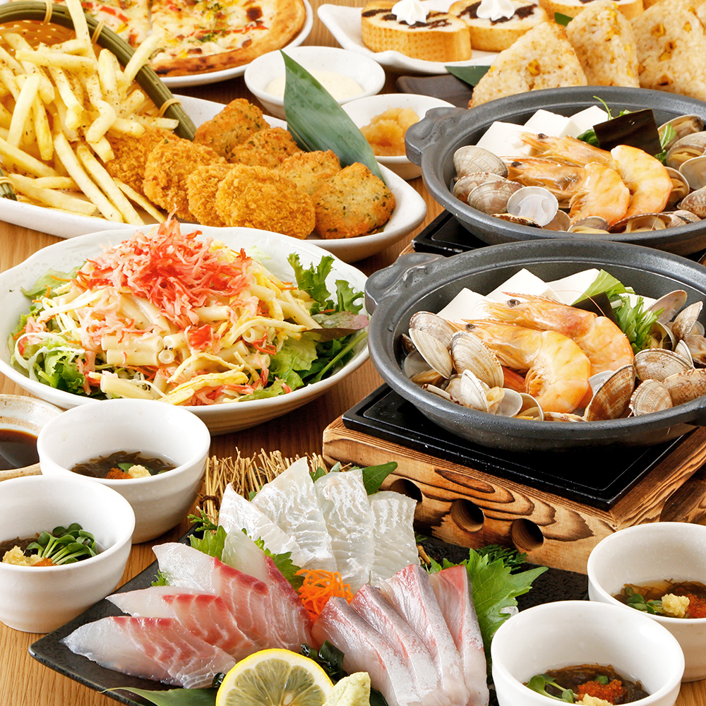 【海宴コース】浅利と海老の蒸し物や刺身三種盛り・明太ポテトピザ等全8品+2H飲放付4000円
