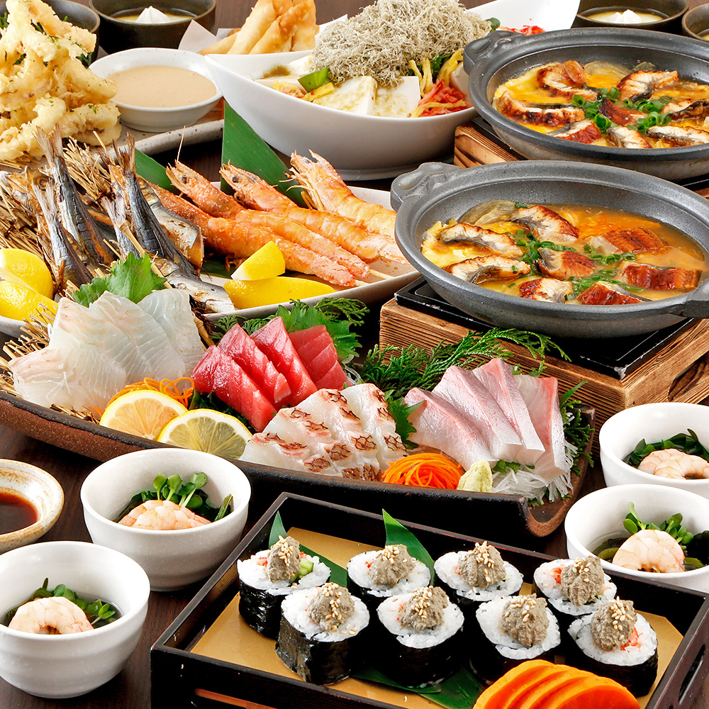 【魚星コース】刺身四種盛りや鰻の玉子とじ・いわしと海老の塩焼き等全8品+2H飲放付5000円