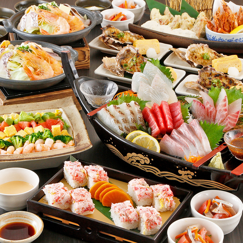 【宝漁コース】刺身五種舟盛りや海鮮漁師焼き・牡蠣の葱みそ焼きや蟹寿司等全8品+2H飲放付6000円