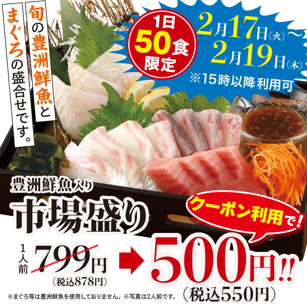 【利用条件】2/17(火)~2/19(木)クーポン使用で「市場盛り」税込550円・2/17(火)~2/20(金)クーポン使用で「刺身定食」税込1,100円/他券・サービス券併用不可/1日50食限定/完売の際はご容赦ください