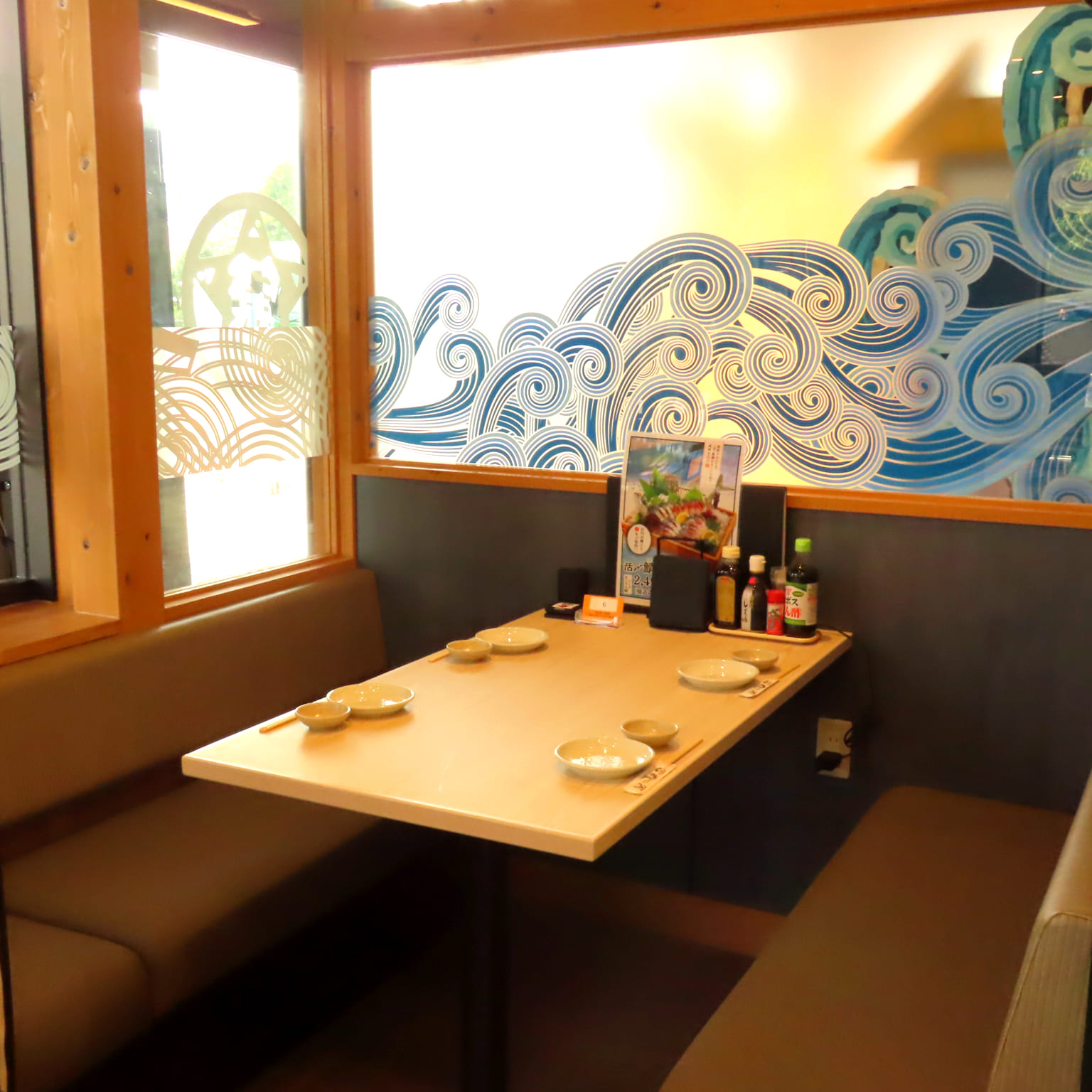 【くつろぎ空間】開放感があり、間接照明がやさしく照らす、ほっと落ち着けるBOX席をご用意しております。デートや友との語らいなどに◎人気のお席ですのでご予約はお早目に。ご来店、心よりお待ちしております♪
