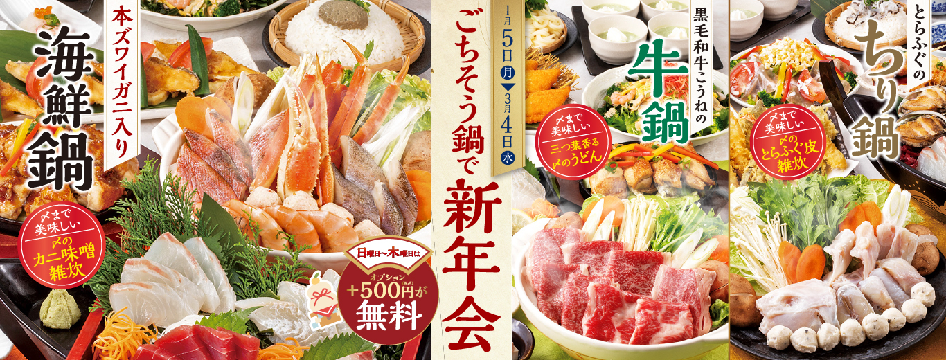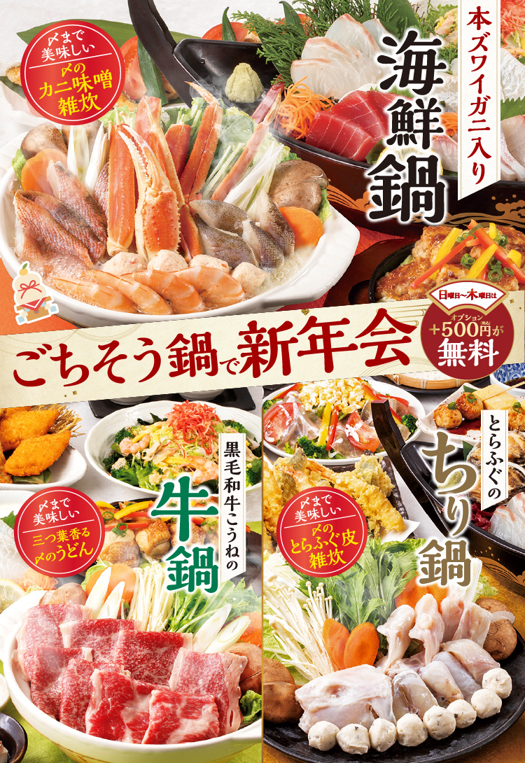 2026年、新年のはじまりは贅沢な“ごちそう鍋”で乾杯!〆のカニ味噌雑炊まで美味しい「本ズワイガニ入り海鮮鍋」、豪華な「とらふぐのちり鍋」、上品な甘みが特徴の「黒毛和牛こうねの牛鍋」がメインの3コースをご用意しております♪